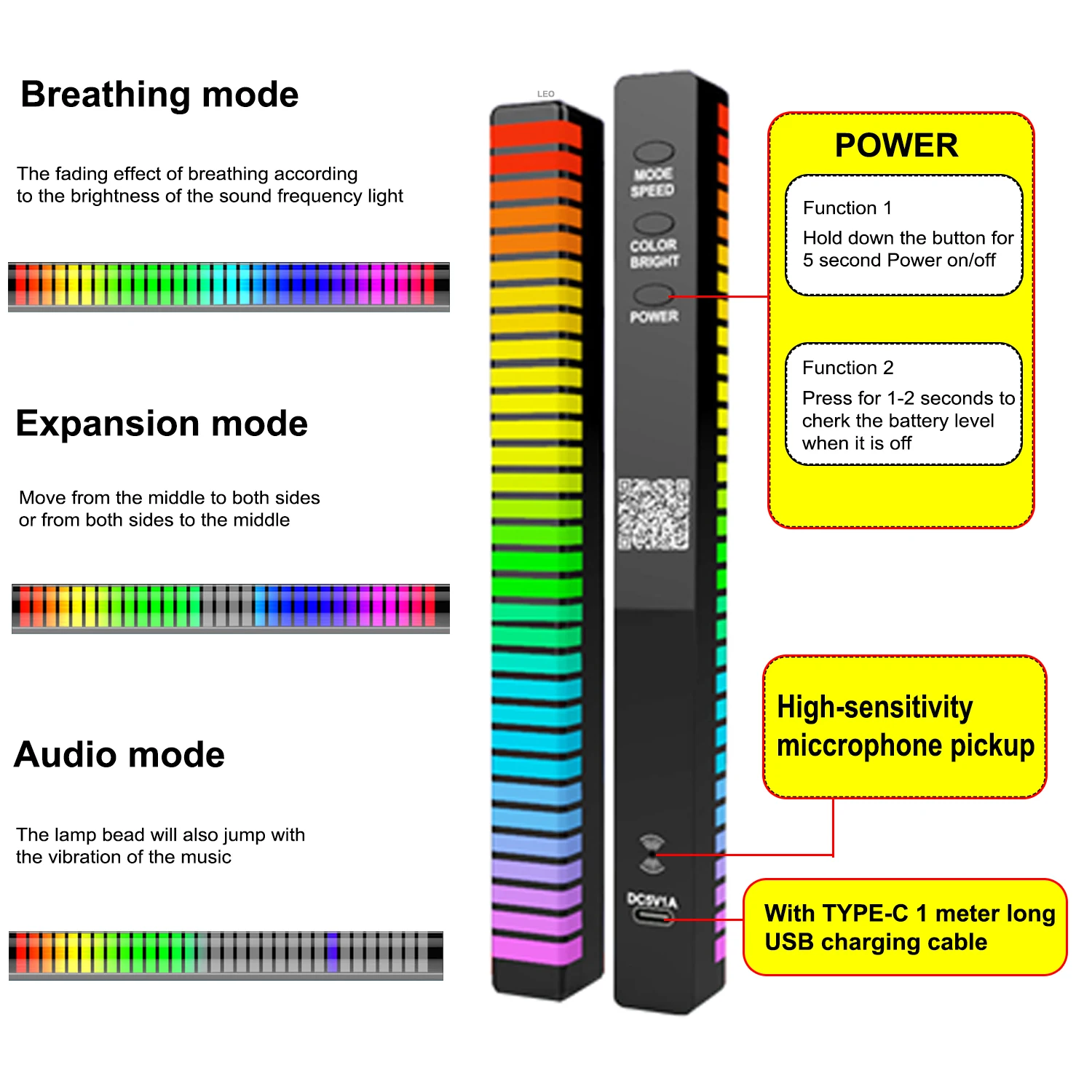 Multiple modes display soft light design. 32 colorful lamp beads, no less than 8 display modes, 5 levels of brightness adjustable, 5 levels of speed adjustable. APP model 210 kinds of phantom color modes are adjustable, 255 kinds of voice control modes are adjustable, brightness/speed/sensitivity is adjustable.