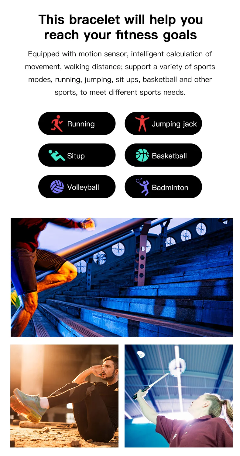 - Function: Passometer,fitness tracker,sleep tracker,Message Reminder,Call Reminder,Answer Call,Dial Call,Remote Control,Push Message,Alarm Clock,week,Month,Heart Rate Tracker,Thermometer,Calendar